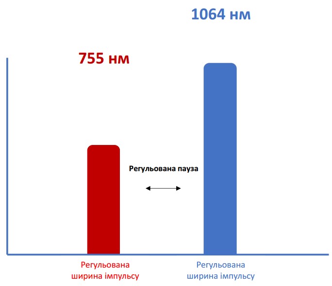 Технологія дозволяє одночасно або послідовно випромінювати лазерні промені з двома довжинами хвилі: олександритовий режим (755 нм) та неодимовий режим Nd:YAG (1064 нм).